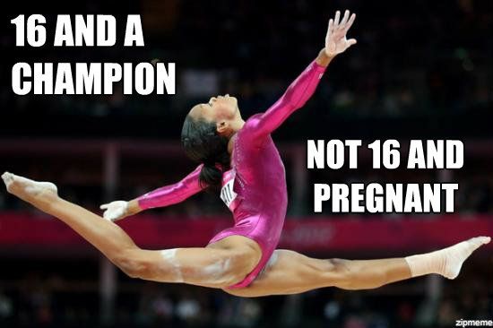All that said, I am sure the meme of Gabby Douglas was made by someone who was well meaning and wanted to make it as sort of an “atta girl”. I know it was posted by some of my friends for that very reason. And while I appreciate that they may not have meant anything by it, why do we need to turn this young woman’s achievement into a PSA to prevent teen pregnancy? What is it about humans that want to turn one woman’s achievement into an opportunity to shame an entirely different group of women.